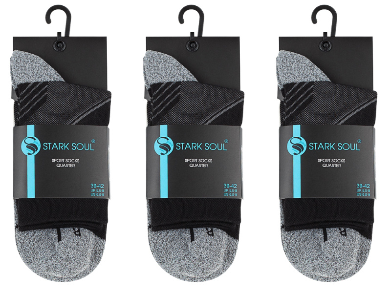 Set van 3 paar quarter sportsokken in de kleur zwart. Deze Quarter sportsokken hebben een halfhoge boord. De sportsokken zijn ontworpen voor zowel mannen als vrouwen die topprestaties willen leveren. De sokken zijn gemaakt van hoogwaardige materialen katoen. Dit zorgt voor een lichte, ademende en slijtvaste sok die optimaal presteert tijdens sportactiviteiten.