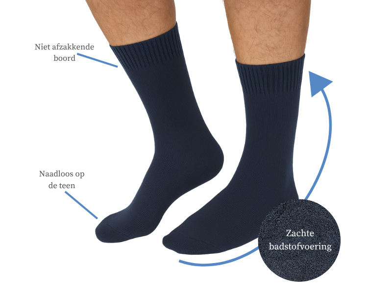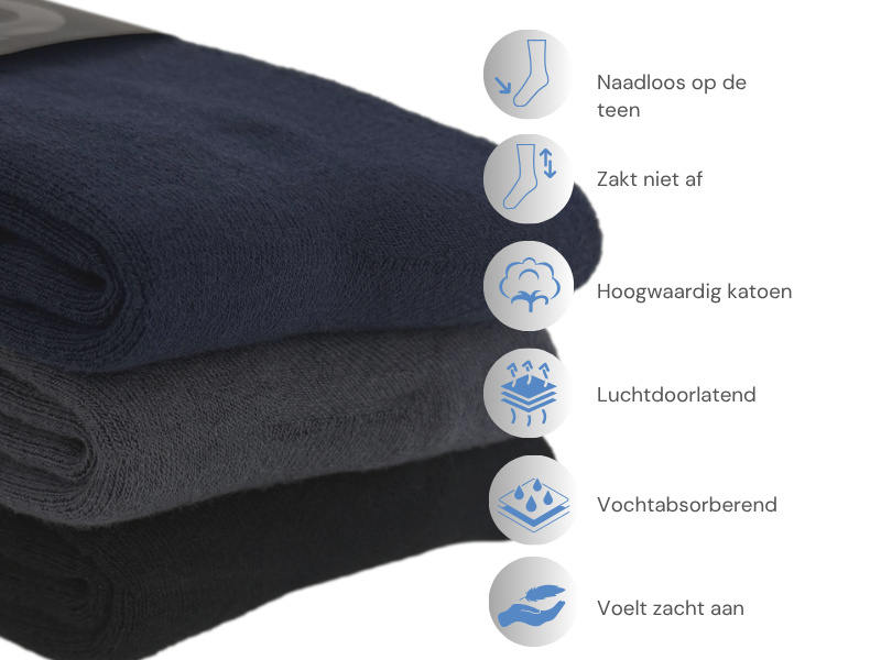 Set van 3 paar naadloze sokken met een volledige badstofvoering aan de binnenzijde, verkrijgbaar in de kleuren zwart, antraciet en marineblauw. Deze badstofsokken bieden een uitzonderlijk zacht gevoel en een extra warm effect op de voeten. De zachte badstofvoering zorgt ervoor dat de voeten heerlijk warm en comfortabel aanvoelen.