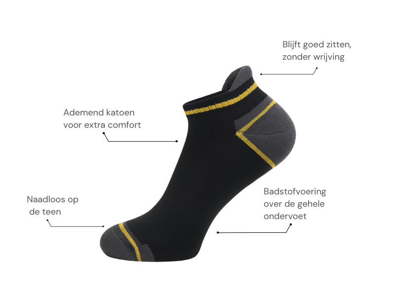 Badstofvoering: De onderkant van de sokken, is voorzien van een badstofvoering voor vochtabsorptie en lichte schokdemping.