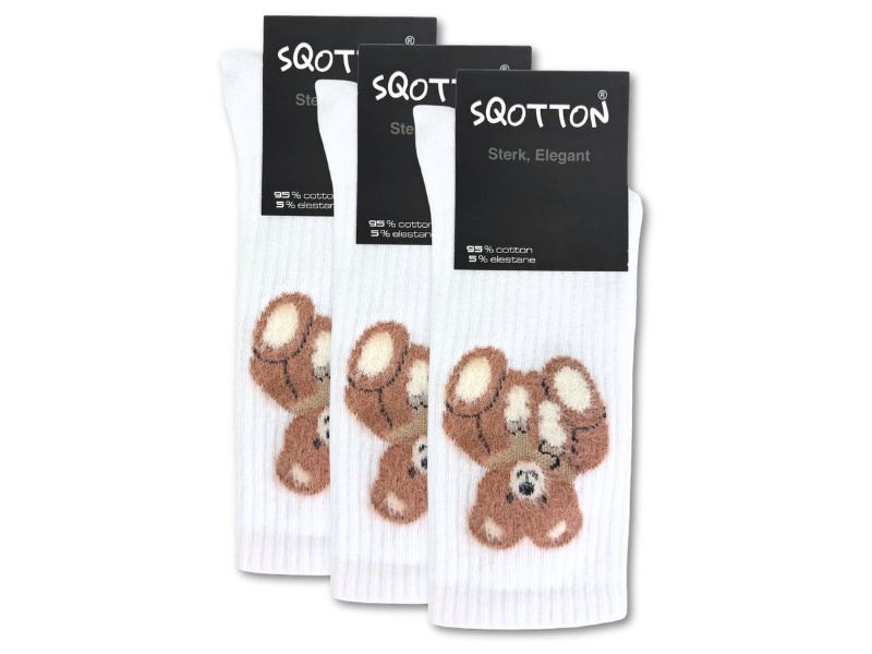 Set van 3 paar katoenen damessokken van het merk SQOTTON® in de kleur wit met teddybeer. Deze damessokken zijn vervaardigd uit een zachte katoenmix, wat zorgt voor een uitstekend draagcomfort. Dankzij het hoge percentage katoen zijn de sokken ademend, anti-transpirerend en zacht voor de huid, waardoor ze perfect zijn voor dagelijks gebruik in alle seizoenen.