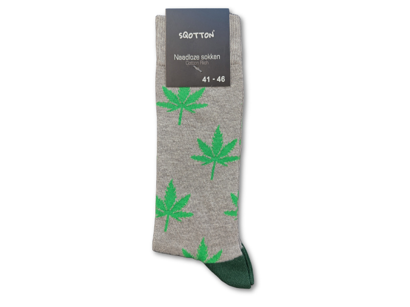 Vrolijke sokken met wietblad print. Deze sokken met print hebben een hoog draagcomfort en zijn daarom ideaal voor dagelijks gebruik. De sokken zijn gemaakt van een zachte katoenmix. Hierdoor zijn de sokken ademend, anti-transpirerend en comfortabel voor je huid. De sokken hebben een elastische boord waardoor de sokken goed blijven zitten. Daarbij hebben deze vrolijke sokken een handgekettelde afwerking zonder voelbare naad bovenop de tenen. Een afwerking zoals deze wordt ook wel naadloos genoemd.